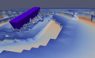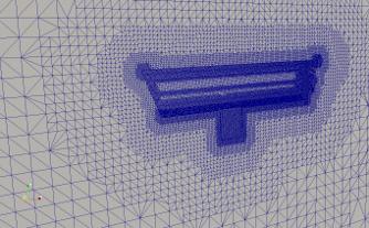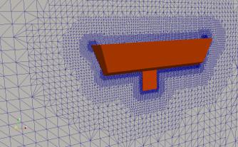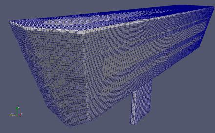 Das simplifizierte Fahrzeug wurde mit dem Meshgenerator Gmsh erzeugt, als STL-Oberflächenmesh exportiert und an die Software OpenFOAM übergeben, um ein 3-dimensionales Netz als Modellgebiet eines Wellentanks zu generieren.